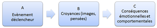 Contrairement aux autres approches, dans la thérapie cognitive on considère que tous les problèmes psychologiques ou psychiatriques sont des conséquences (C), que les problèmes surgissent de nos croyances ou pensées (B) et non pas d’un évènement déclencheur (A). Dans l’exemple de Karine, ce n’est pas l’évènement déclencheur le problème (l’attaque de panique), mais les pensées (les « monologues intérieurs ») qui en ont découlé « j’aurai pu mourir, j’ai cru que j’allais devenir folle, ça peut recommencer n’importe où, n’importe quand, et si personne ne peut m’aider ? Si ça arrive pendant que je conduis ? »
